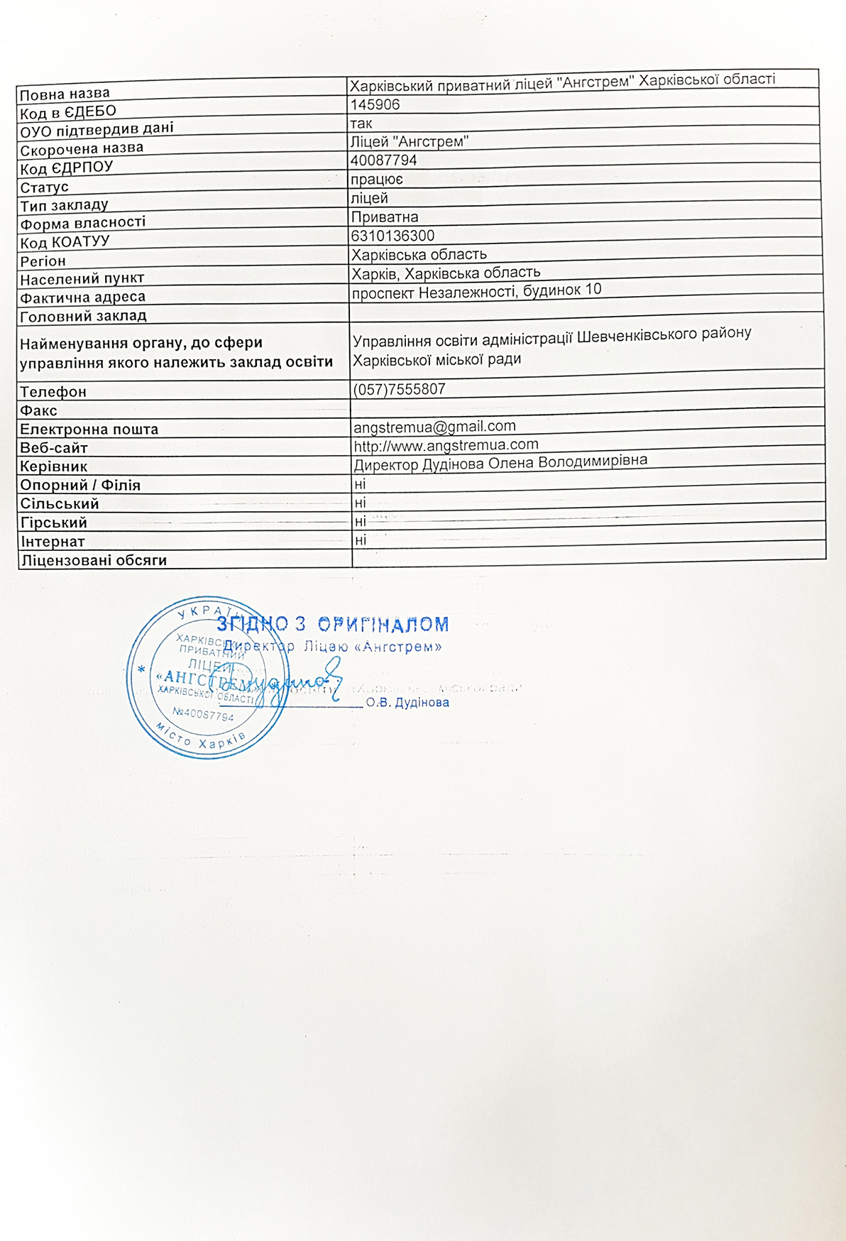 Лiцей «Ангстрем» зареєстровано Харківським міським управлінням юстиції 26.11.2020 р. (свідоцтво про державну реєстрацію № 1004801070004067624), має державну ліцензію АА № 214791 від 12.02.2016, видану Департаментом науки і освіти Харківської обласної державної адміністрації на надання освітніх послуг у сфері загальної середньої освіти.